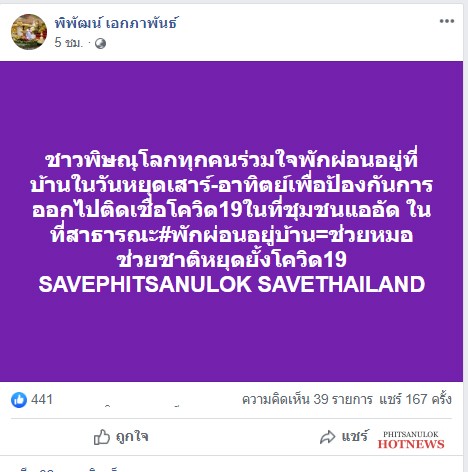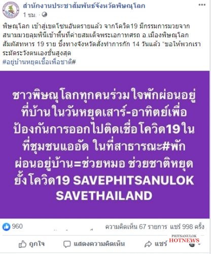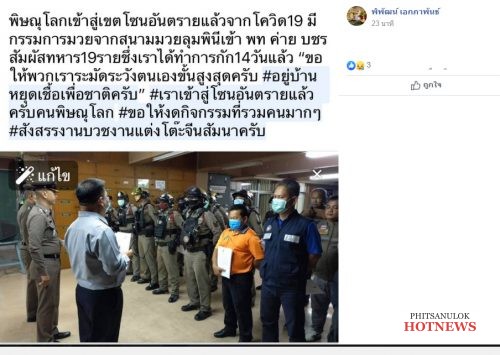 วันที่ 21 มีนาคม 2563 ผู้สื่อข่าวรายงานว่า เฟซบุ๊คนายพิพัฒน์ เอกภาพันธ์ ผวจ. พิษณุโลก ได้โพสต์ระบุว่า ขอชาวพิษณุโลกทุกคนร่วมใจพักผ่อนอยู่บ้าน ในวันหยุดเสาร์-อาทิตย์ เพื่อป้องกันการออกไปติดเชื้อโควิด 19 ในที่ชุมชนแออัด ในที่สาธารณะ พัผผ่อนอยู่บ้าน ช่วยหมอ ช่วยชาติหยุดยั้งโควิด 19 SAVEPHITSANULOK SAVETHAILAND และในท้ายโพสต์ผวจ.พิษณุโลกยังโพสต์ภาพพร้อมข้อความว่า พิษณุโลกเข้าสู่โซนอันตรายแล้วจากโควิด 19 มีกรรมการมวยจากสนามมวยลุมพินีเข้าพื้นที่ค่ายบชร. สัมผัสกับทหาร 19 นาย ซึ่งเราได้ทำการกักตัว 14 วันแล้ว ขอให้พวกเราระมัดระวังตนเองขั้นสูงสุดครับ อยู่บ้านหยุดเชื้อเพื่อชาติ เราเข้าสู่โซนอันตรายแล้วพิษณุโลก ขอให้งดกิจกรรมที่รวมคนมาก ๆ งานสังสรรค์งานบวชงานแต่งโต๊ะจีนสัมมนา