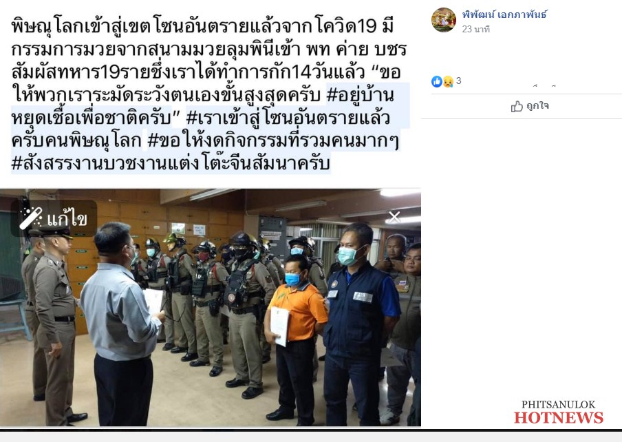 นอกจากนี้ เพจของสำนักงานประชาสัมพันธ์จังหวัดพิษณุโลก ได้โพสต์แจ้งเตือน ระบุว่า พิษณุโลก เข้าสู่เขตโซนอันตรายแล้ว จากโควิด19 มีกรรมการมวยจากสนามมวยลุมพินีเข้าพื้นที่ค่ายสมเด็จพระเอกาทศรถ อ.เมืองพิษณุโลก สัมผัสทหาร 19 ราย ชึ่งทางจังหวัดสั่งทำการกัก 14 วันแล้ว “ขอให้พวกเราระมัดระวังตนเองขั้นสูงสุด #อยู่บ้านหยุดเชื้อเพื่อชาติ#