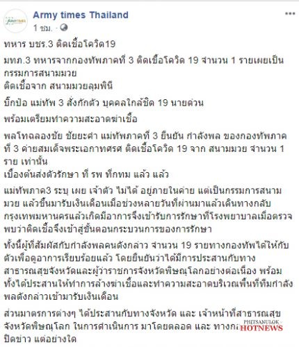 วันเดียวกัน เพจ Army times Thailand โพสต์ข่าวดังกล่าวว่า ด่วน!! ทหารบชร.3 ( กองบัญชาการช่วยรบที่ 3 ) ค่ายสมพระเอกาทศรถ ติดเชื้อโควิด19 จำนวน 1 ราย บิ๊กป๋อ มทภ.3 สั่งกักตัวคนใกล้ชิด 19 ราย ย้ำ ติดแค่คนเดียว เจ้าตัวพักรักษา ตัว อยู่ กรุงเทพ แม่ทัพ เผยเป็นกรรมการสนามมวย ติดเชื้อจาก สนามมวยลุมพินี แม่ทัพสั่งกักตัว บุคคล ใกล้ชิด 19 นาย เตรียมทำความสะอาดฆ่าเชื้อ