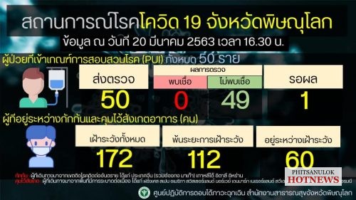 สำนักงานสาธารณสุขจังหวัดพิษณูโลก รายงานสถานการณ์โรคโควิด 19 ของจังหวัดพิษณุโลก ข้อมูล ณ วันที่ 20 มีนาคม 2563 ว่า ผู้ป่วยที่เข้าเกณฑ์การสอบสวนโลกทั้งหมด 50 ราย ซึ่งผลตรวจไม่พบเชื้อ 49 รายรอผล 1 ราย ผู้ที่อยู่ระหว่างกักกันและคุมไว้สังเกตอาการเฝ้าระวังทั้งหมด 72 รายพ้นระยะการเฝ้าระวัง 112 รายอยู่ระหว่างการเฝ้าระวัง 60 ราย