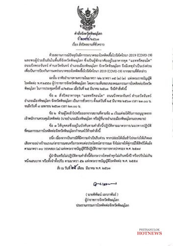 ดังนั้นเพื่อให้การควบคุมป้องกันการแพร่ระบาดของโรคติดเชื้อไวรัสโคโรน่า 2019 (COVID-19) จากสถานที่ดังกล่าวเป็นไปอย่างมีประสิทธิภาพ ผู้ว่าราชการจังหวัดพิษณุโลก โดยความเห็นชอบของคณะกรรมการโรคติดต่อจังหวัดพิษณุโลก จึงมีคำสั่งปิดชั่วคราวสถานที่สาธารณะที่เสี่ยงต่อการติดโรคเพื่อให้ครอบคลุมสถานที่เสี่ยงทุกแห่งในพื้นที่จังหวัดพิษณุโลก ตั้งแต่วันที่ 26 มีนาคม 2563 จนถึง 30 เมษายน 2563”
