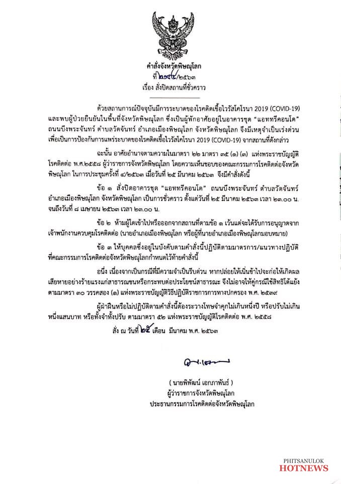 ซึ่งล่าสุดได้มีคำสั่งปิดสถานที่พักของ ผู้ติดเชื้อหญิงรายแรก ของจังหวัดพิษณุโลก โดยอาศัยอำนาจตามความในมาตรา 22 มาตรา 35 (1) (3) แห่งพระราชบัญญัติ พ.ศ.2548 ผู้ว่าราชการจังหวัดพิษณุโลก โดยความเห็นชอบของคณะกรรการโรคติดต่อจังหวัดพิษณุโลก จึงมีคำสั่ง ข้อ 1 ปิดอาคารชุด แอททรีคอนโด ถ.บึงพระจันทร์ ต.วัดจันทร์ อ.เมือง จ.พิษณุโลก เป็นการชั่วคราวตั้งแต่วันที่ 25 มีนาคม 2563 เวลา 23.00 น. จนถึงวันที่ 8 เมษายน 2563 เวลา 23.00 น. และห้ามผู้ใดเข้าไป หรือออกจากสถานที่ดังกล่าว เว้นแต่จะได้รับการอนุญาตจากเจ้าพนักงานควบคุมโรคติดต่อ (นายอำเภอเมืองพิษณุโลก หรือผู้ที่นายอำเภอเมืองพิษณุโลกมอบหมาย) และให้บุคคลซึ่งอยู่ในบังคับตามคำสั่งปฏิบัติตามมาตรการ/แนวทางที่คณะกรรมการโรคติดต่อจังหวัดพิษณุโลกกำหนดไว้อย่างเคร่งครัด