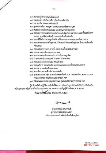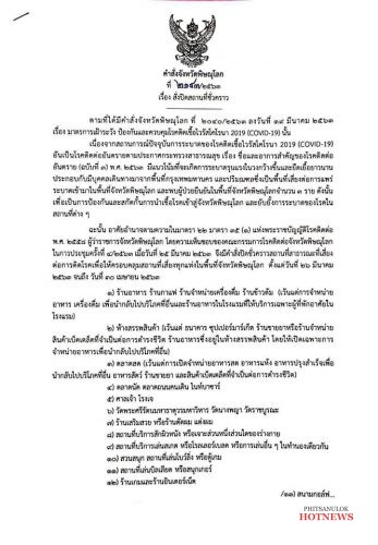 สั่ง ณ วันที่ 25 มีนาคม 2563 ลงนามโดยนายพิพัฒน์ เอกภาพันธ์ ผู้ว่าราชการจังหวัดพิษณุโลก ประธานกรรมการโรคติดต่อจังหวัดพิษณุโลก
