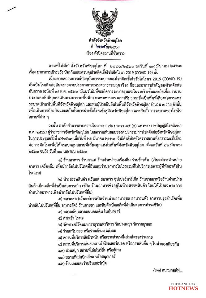 วันที่ 25 มีนาคม 2563 นายพิพัฒน์ เอกภาพันธ์ ผู้ว่าราชการจังหวัดพิษณุโลก ประธานกรรมการโรคติดต่อจังหวัดพิษณุโลก ออกคำสั่งจังหวัดพิษณุโลกที่ 2193 / 2563 เรื่องสั่งปิดสถานที่ชั่วคราว