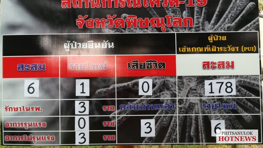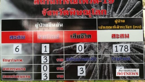 สำหรับสถานการณ์โรคโควิด-19 ของจังหวัดพิษณุโลก ปัจจุบันมีผู้ป่วยยืนยัน 6 ราย กลับบ้าน 3 ราย ผู้ป่วยเข้าเกณฑ์เฝ้าระวังสะสม 179 ราย