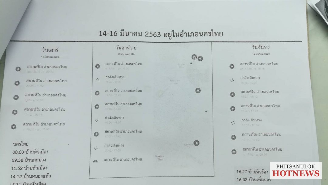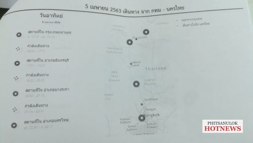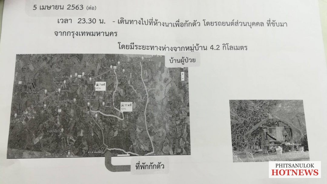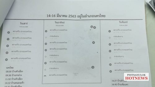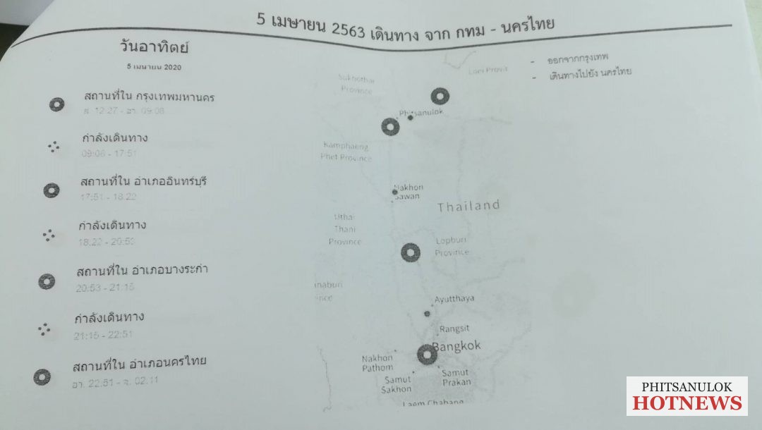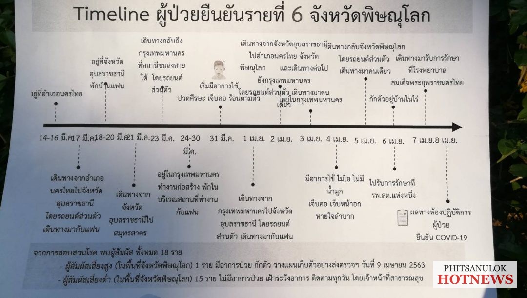 โดยทางจังหวัดได้ทำการตรวจสอบไทมไลน์ของผู้ป่วยผ่านทาง GPS เริ่มจาก 14 -16 มี.ค. พักอาศัยอยู่ที่อำเภอนครไทย วันที่ 17 มี.ค. เดินทางจากอำเภอนครไทยไปจังหวัดอุบลราชธานี โดยรถยนต์ส่วนตัว พร้อมแฟน 18-20 มี.ค. อยู่ที่จังหวัดอุบลราชธานี พักบ้านแฟน 21 มี.ค. เดินทางจากจังหวัดอุบลราชธานีไปสมุทรสาครพร้อมแฟน 23 มี.ค. เดินทางกลับถึงกรุงเทพมหานครที่สถานีขนส่งสายใต้ โดยรถยนต์ส่วนตัว 24-30 มี.ค. อยู่ในกรุงเทพมหานคร ท่างานก่อสร้าง พักในบริเวณสถานที่ท่างานกับแฟน 31 มี.ค.เริ่มมีอาการไข้ ปวดศีรษะ เจ็บคอ ร้อนตามตัว 1 เม.ย. เดินทางจากกรุงเทพมหานครไปยังจังหวัดอุบลราชธานี โดยรถยนต์ส่วนตัว เพื่อส่งแฟน ที่อำเภอสีเมืองใหม่ จังหวัดอุบลราชธานี 2 เม.ย. เดินทางจากกลับจากจังหวัดอุบลราชธานี มาอำเภอนครไทย จังหวัดพิษณุโลก มาเก็บของ และเดินทางต่อไปยังกรุงเทพมหานคร โดยรถยนต์ส่วนตัว