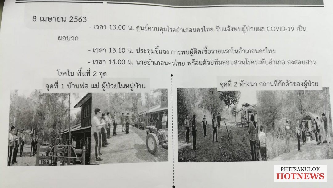 3 เม.ย. พักอาศัยอยู่ในกรุงเทพมหานคร 4 เม.ย. มีอาการไข้ ไม่ไอ ไม่มีน้ำมูก เจ็บคอ เจ็บหน้าอก หายใจลำบาก จึงประสานเตรียมสถานที่กักตัวไว้ล่วงหน้า (กระท่อมภายในไร่) ตัวผู้ป่วยเองได้กักตัวเอง ที่กระท่อมในไร่ของตัวเอง 5 เม.ย. เดินทางกลับจังหวัดพิษณุโลก โดยรถยนต์ส่วนตัว เดินทางมาคนเดียว วันที่ 6 เมษายน อาการ ไข้ ไม่ทุเลา จึงไปตรวจที่โรงพยาบาลส่งเสริมสุขภาพตำบล เนินเพิ่ม อำเภอนครไทย ขณะที่ไปตรวจผู้ป่วยสวมหน้ากากอนามัย เจ้าหน้าที่สวมหน้ากากอนามัย face shield และชุดคลุมกันน้ำ วันที่ 7 เมษายน อาการไข้ ปวดศีรษะ ไม่ทุเลา จึงมารับการตรวจที่คลินิกตรวจโรคทางเดินหายใจ(AR Clnic) โรงพยาบาลสมเด็จพระยุพราชนครไทย ได้ให้เข้ารักษาตัวในห้องแยกโรคของโรงพยาบาล ผลการตรวจเบื้องต้น ภาพรังสีทรวงอก ปกติ และ.วันที่ 8 เมษายน ได้รับการส่งตรวจ ผลPositive for COVID-19 ขณะนี้ผู้ป่วยยังรักษาตัวอยู่ในโรงพยาบาลพุทธชินราชพิษณุโลก อำเภอเมือง จังหวัดพิษณุโลก