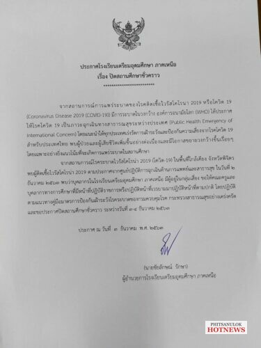 ขณะที่โรงเรียนนครไทย อ.นครไทย จ.พิษณุโลก เนื่องจากพบว่า ครูโรงเรียนนครไทยคนหนึ่ง ได้เดินทางกลับมาจากกรุงเทพมหานคร เมื่อวันที่ 28 ธันวาคม 2563 โดยเครื่องบิน เที่ยวบินเดียวกันกับผู้ป่วยรายดังกล่าว ดังนั้น เพื่อป้องกันการแพร่ระบาดของเชื้อไวรัสโคโรนา 2019 (COVID-19) โรงเรียนนครไทย จึงมีมาตรกาป้องกันการติดเชื้อไวรัสโคโรนา 2019 (COVID-19) ดังนี้ 1.กำหนดปิดสถานศึกษาชั่วคราว ระหว่างวันที่ 3 – 4 ธันวาคม 2563 2.ให้ครูและบุคลากรทางการศึกษาที่มีหน้าที่ราชการหรือปฏิบัติหน้าที่เวรยาม มาปฏิบัติหน้าที่ตามปกติ 3.ให้ครูและบุคลากรทางการศึกษา และนักเรียนสวมใส่หน้ากากผ้า หรือหน้ากากอนามัย ล้างมือด้วยเจลแอลกอฮอล์ รักษาระยะห่าง (SOCAL DISTANCING) และปฏิบัติตามมาตรการของกรมควบคุมโรคกระทรวงสาธารณสุขอย่างเคร่งครัด