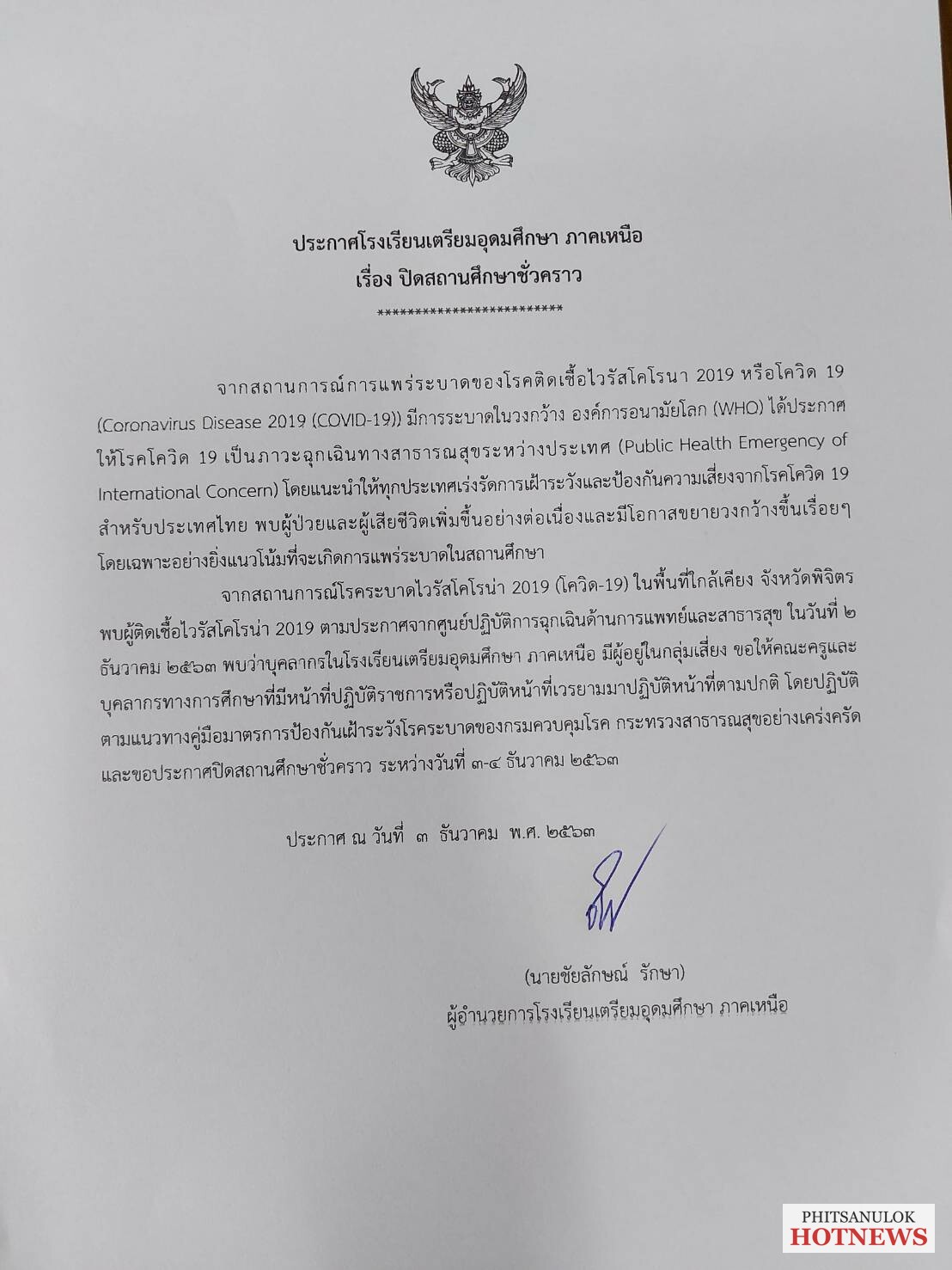 โดยที่โรงเรียนเตรียมอุดมศึกษาภาคเหนือ ที่ปิดนั้นเนื่องจากมีคุณครูจำนวน 2 คน ที่ไปเล่นดนตรีในผับชื่อดังของจังหวัดพิจิตร และหญิงสาว 25 ปี ผู้ป่วยโควิด ได้ไปเที่ยวมา 2 คืน ส่งผลให้ทางคณะกรรมการควบคุมโรคติดต่อจังหวัดพิษณุโลก ได้ตรวจหาโควิดแล้ว ซึ่งเบื้องต้นยังต่อผลตรวจอีกครั้ง ส่งผลให้นายชัยลักษณ์ รักษา ผู้อำนวยการโรงเรียนเตรียมอุดมศึกษาภาคเหนือ ได้สั่งปิดโรงเรียน และให้ผู้ปกครองมารอรับนักเรียนกลับบ้านในช่วงเข้าที่ผ่านมา พร้อมทั้งห้ามบุคคลภายนอกห้ามเข้าออกโรงเรียน ส่วนบุคลากรของโรงเรียนสามารถเข้าไปเคลียร์งานได้ แต่ต้องสวมหน้ากาก วัดไข้เข้าออกที่บริเวณประตูป้อมยาม ส่วนช่วงบ่ายก็จะมีการฉีดยาฆ่าเชื้อภายในโรงเรียน