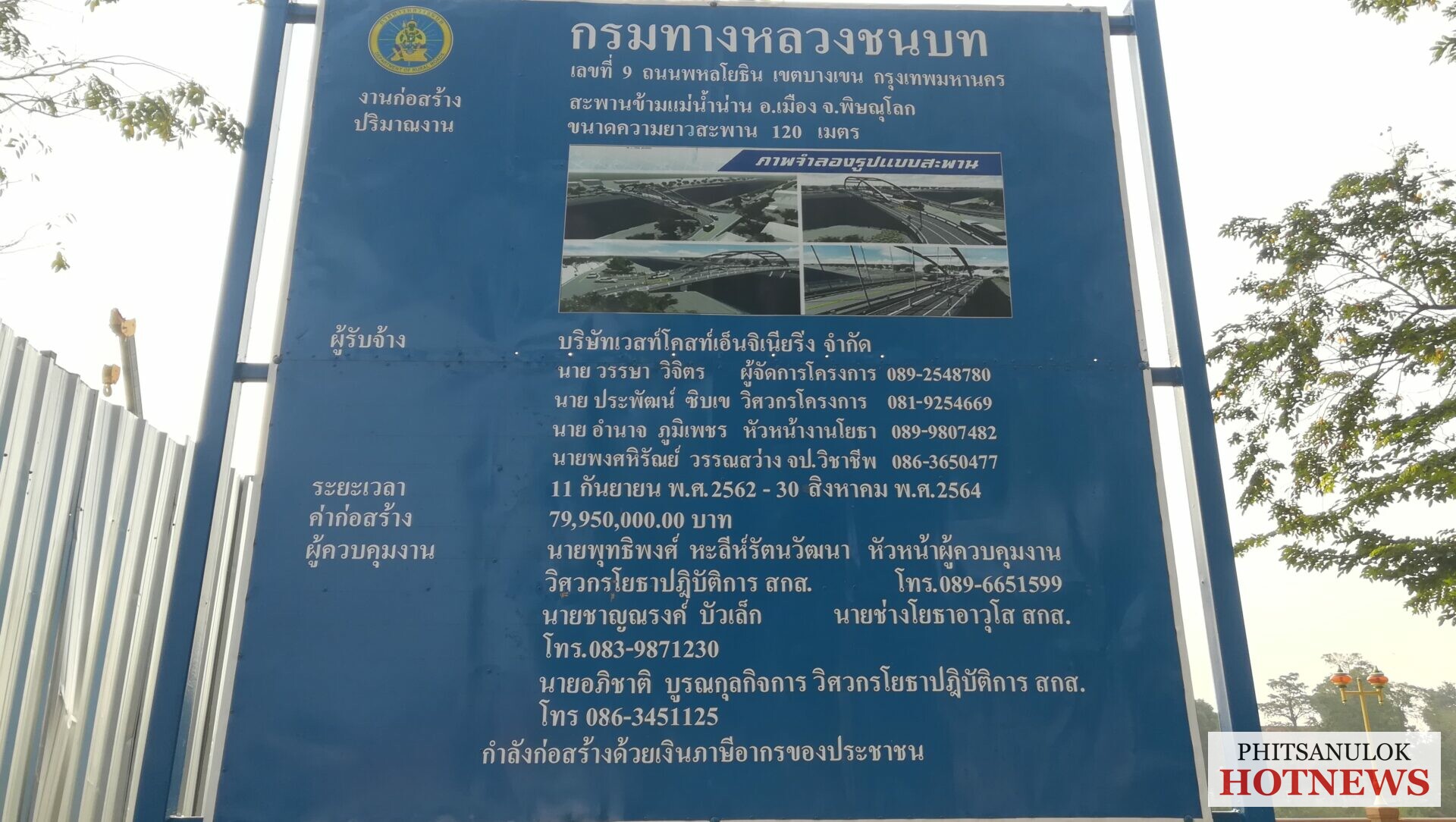 สะพานข้ามแม่น้ำน่านของจ.พิษณุโลก แห่งใหม่นี้ เป็นความรับผิดชอบของกรมทางหลวงชนบท มีระยะเวลาก่อสร้างตั้งแต่วันที่ 11 กันยายน 2562 ถึง 30 สิงหาคม 2564 ค่าก่อสร้าง 79.9 ล้านบาท ผู้รับจ้างก่อสร้างบริษัท เวสท์โคสท์ เอ็นจิเนียริ่ง จำกัด ขณะนี้การดำเนินการก่อสร้างคืบหน้าไปมากแล้ว ได้วางโครงสร้างพื้นสะพานเรียบร้อยแล้ว และกำลังขึ้นเหล็กโค้งบริเวณเหนือสะพาน คาดว่าหลังก่อสร้างแล้วเสร็จจะเป็นอีกเส้นทางหนึ่ง ในการระบายการจราจรของเมืองพิษณุโลก รวมถึงส่งเสริมการท่องเที่ยวในจังหวัดพิษณุโลกในการเชื่อมโยงสองฝั่งน่าน ระหว่างฝั่งวัดใหญ่ หรือ วัดพระศรีรัตนมหาธาตุวรมหาวิหาร และฝั่งพระราชวังจันทน์