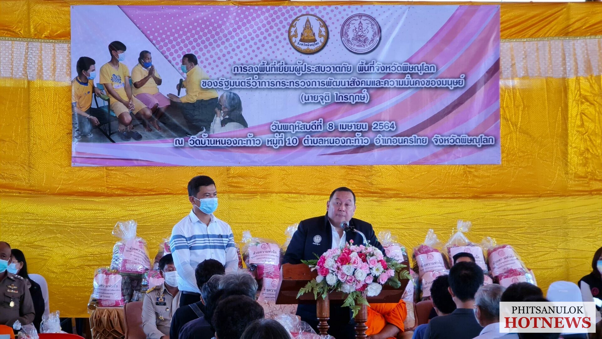 วันที่ 8 เม.ย.64 นายจุติ ไกรฤกษ์ รัฐมนตรีว่าการกระทรวงการพัฒนาสังคมและความมั่นคงของมนุษย์ เดินทางไปที่วัดบ้านหนองกะท้าว หมู่ 10 ต.หนองกะท้าว อ.นครไทย จ.พิษณุโลก เพื่อช่วยเหลือผู้ประสบวาตภัย จากเหตุพายุฤดูร้อนเมื่อวันที่ 3 เมษายนที่ผ่านมา มีนายรณชัย จิตรวิเศษ ผู้ว่าราชการจังหวัดพิษณุโลก พร้อมด้วยนายนิสิต สวัสดิเทพ นายอำเภอนครไทย และหัวหน้าส่วนราชการให้การต้อนรับ และร่วมกันมอบถุงยังชีพให้แก่ผู้ประสบภัยบ้านพังเสียหายบางส่วนใน 4 ตำบล 23 หมู่บ้าน 127 หลังคาเรือน