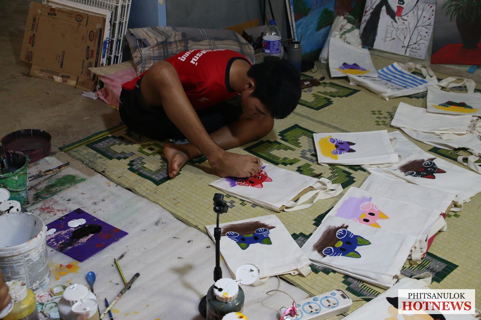 ปัจจุบันน้องทาม นอกจากตั้งใจเรียนแล้ว ยังใช้เวลาว่างวาดภาพระบายสีบนผืนผ้าใบด้วยเท้า นำผลงานขายในเฟซบุ๊ก เพื่อหาเงินมาช่วยแม่ และหาทุนศึกษาต่อ