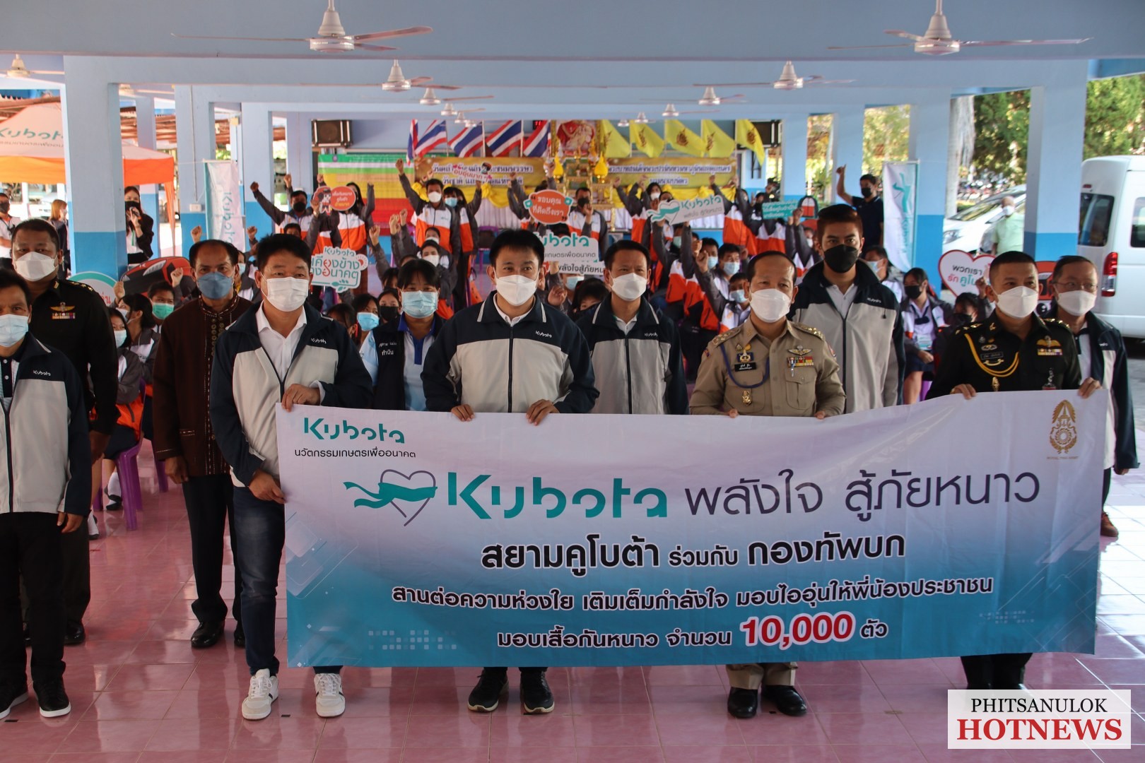 วันที่ 9 ธันวาคม 2564 ที่โรงเรียนนาบัววิทยา ต.นาบัว อ.นครไทย จ.พิษณุโลก นายชูศักดิ์ รู้ยิ่ง ปลัดจังหวัดพิษณุโลก พร้อมด้วยพันเอก สุวัฒน์ เฉลิมเกียรติ เสนาธิการ มณฑลทหารบกที่ 39 นายพิษณุ มิลินทานุช ผู้ช่วยกรรมการผู้จัดการใหญ่ ผู้จัดการทั่วไป สายงานขาย การตลาดและบริการ บริษัทสยามคูโบต้าคอร์ปอเรชั่น จำกัด ร่วมเปิดโครงการ “คูโบต้าพลังใจสู้ภัยหนาว” ซึ่งทางบริษัทสยามคูโบต้าคอร์ปอเรชั่น จำกัด ได้จัดกิจกรรมสานต่อความห่วงใย เติมเต็มกำลังใจ มอบไออุ่น ให้พี่น้องประชาชน ในโครงการ “คูโบต้าพลังใจสู้ภัยหนาว” ปีที่ 22 จัดขบวนคาราวานร่วมกับกองทัพบก ต่อเนื่องเป็นปีที่ 8 ลงพื้นที่มอบเสื้อกันหนาว 10,000 ตัว ให้แก่พี่น้องประชาชนที่ประสบภัยหนาว และขาดแคลนเครื่องนุ่งห่ม 4 จังหวัด ในพื้นที่ภาคเหนือ ได้แก่ จังหวัดอุตรดิตถ์ และจังหวัดพิษณุโลก ภาคตะวันออกเฉียงเหนือ ได้แก่ จังหวัดกาฬสินธุ์ และจังหวัดบุรีรัมย์ จังหวัดละ 2500 ตัว