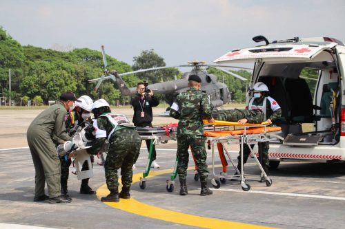 – จำลองเหตุการณ์รับผู้ป่วยจากพื้นที่ห่างไกลส่ง โรงพยาบาลศูนย์ อากาศยานยกตัวจาก สนามบิน หน่วยบินทหารบกยุทธวิธีที่ 3 ค่ายสมเด็จพระเอกาทศรถ ไปยัง โรงพยาบาลพุทธชินราช 1 เที่ยวบิน