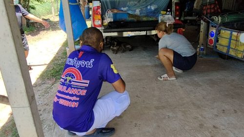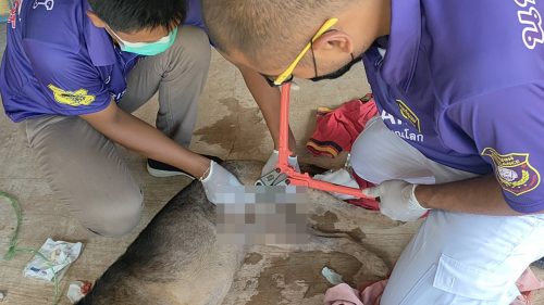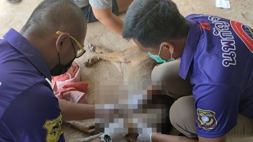 วันนี้( 18 สิงหาคม 2565 เจ้าหน้าที่จิตอาสาหมาแมว ชมรมช่วยสัตว์พิศณุโลกย์ ศูนย์วิทยุบางแก้วเมตตาธรรม นำโดยนายนพกัญย์ ใจอารีย์ รับแจ้งจาก น.ส.ฐิติกาล วันทอง อายุ23ปี อยู่บ้านเลขที่ 132/1 ม.2 ต.สมอแข อ.เมือง จ.พิษณุโลก เพื่อช่วยเหลือสุนัข ที่เลี้ยงไว้ หลังจากมีคนใจยักษ์ใช้ลูกดอกปืนฉมวก ที่ทำจากเหล็กก้านร่ม ยิงใส่ลำตัวของสุนัขจนคาไว้กับร่างตลอดเวลา หลังจากเจ้าหน้าที่รับแจ้งก็ไปดำเนินการช่วยเหลือ ซึ่งพบว่า สุนัขดังกล่าว เป็นเพศผู้ อายุ ประมาณ 4 ปี ชื่อ “เจ้าเก้ง” ถูกลูกดอกก้านร่ม เสียบบริเวณก้นทะลุท้อง ทางเจ้าหน้าที่จึงได้ให้เจ้าของทำการจับเจ้าเก้งไว้ และพิจารณาว่า เหล็กก้านร่มดังกล่าว ไม่ถูกอวัยวะสำคัญ จึงใช้อุปกรณ์ตัดเหล็กออก แล้วดึงย้อน สามารถนำเหล็กดังกล่าว ออกมาจากร่างของเจ้าเก้ง ได้ในที่สุด ซึ่งหลังนั้นทางเจ้าของก็จะนำเจ้าเก้ง ไปให้ทางสัตวแพทย์ ดูแลอาการและรักษาบาดแผลต่อไป