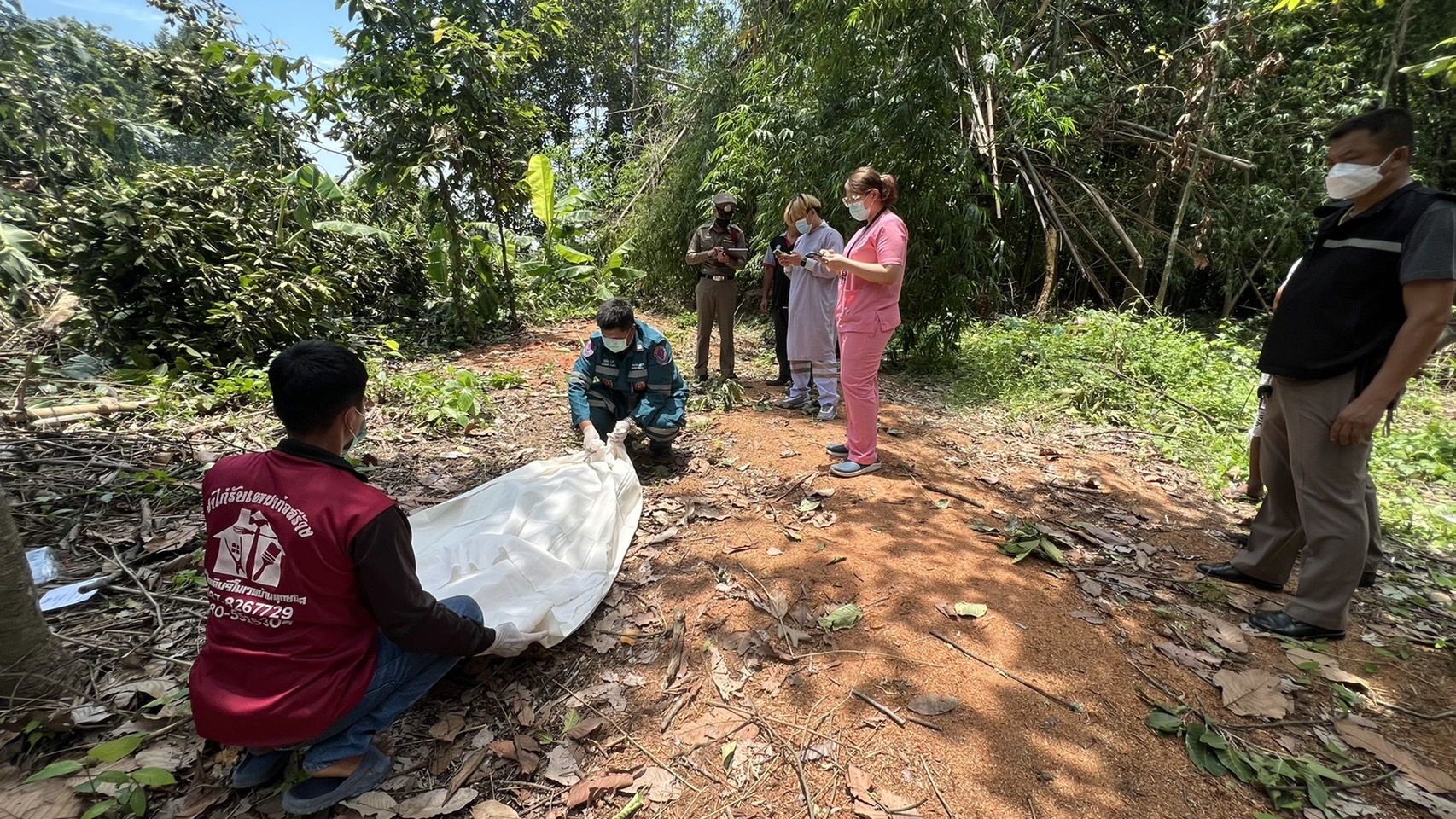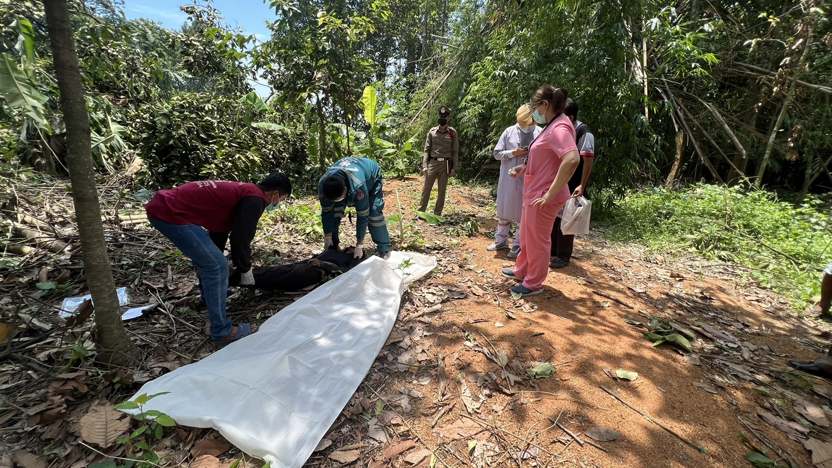 ในที่เกิดเหตุเป็นไร่อยู่ในป่า พื้นที่บ้านวงฆ้อง พบร่างผู้เสียชีวิตเป็นชายนอนหงายเสียชีวิตอยู่ใต้ต้นยางนา ความสูงประมาณ 20 เมตร ลักษณะบริเวณลำคอผิดรูป สวมเสื้อแขนยาวสีกรม กางเกงขายาวสีตำ ทราบชื่อคือ นายศราวุธ เพชรพล อายุ 23 ปี ชาวบ้าน 50 ม. 9 ต.ดงประคำ อ.พรหมพิราม จ.พิษณุโลก