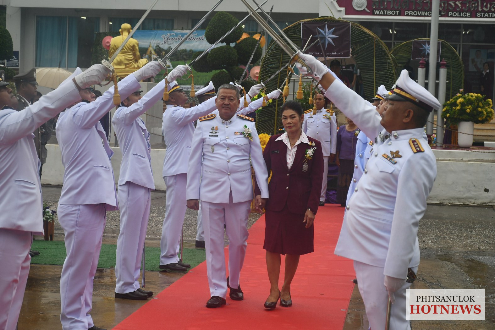 โดยในพิธีเป็นไปอย่างเรียบง่าย โดยให้ผู้ที่เกษียณ ทั้ง 3 นาย ได้ลอดซุ้มกระบี่ ของนายตำรวจชั้นสัญญาบัตร เพื่อเดินไปกราบไหว้พระพุทธรูป สักการะ พระบรมรูปในหลวงรัชกาลที่ 9 ก่อนที่จะเดินมารับดอกไม้จากเจ้าหน้าที่ตำรวจ ทั้ง 2 ข้างทาง ซึ่งในครั้งนี้ดอกไม้ที่นำมามอบให้กับผู้เกษียน เป็นดอกบัวหลวง ช่อเม็ดบัว และกล้วยดิบเป็นหวีๆแทนดอกไม้และดอกกุหลาบ ที่ไม่เหมือนใครมาก่อน นอกจากนี้ยังมีพืชผักสวนครัว และผลไม้ นำมามอบแสดงความยินดีในครั้งนี้ด้วย โดย ร.ต.อ.สงวน พ่วงพลอย รอง สว.(สอบสวน) สภ.วัดโบสถ์ กล่าวอีกด้วยว่า รู้สึกแปลกๆ ที่ได้รับดอกบัวหลวง มาแสดงความยินดีในครั้งนี้ แต่ก็ประทับใจเป็นอย่างมากที่ทาง สภ.วัดโบสถ์ จัดพิธีเกษียนในอย่างสมเกียรติ