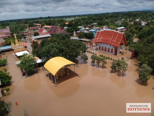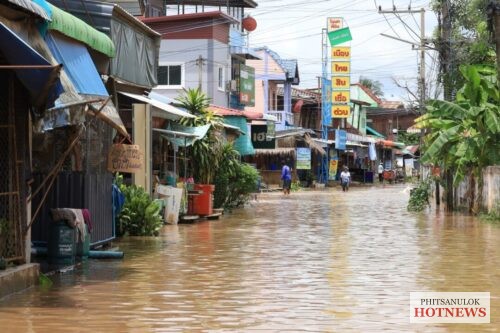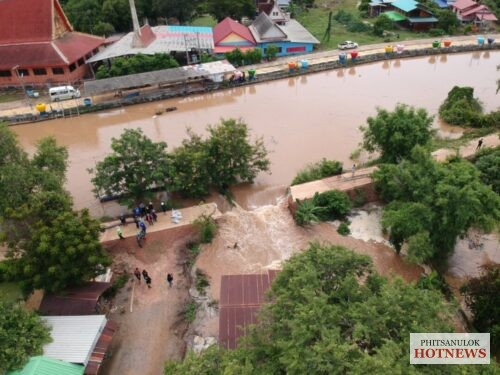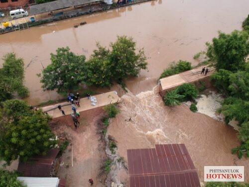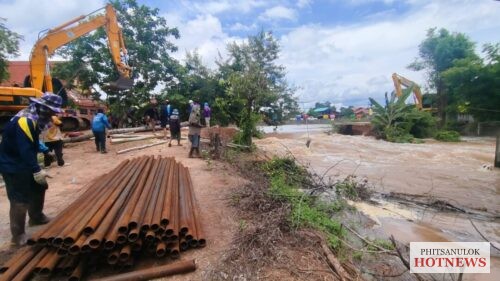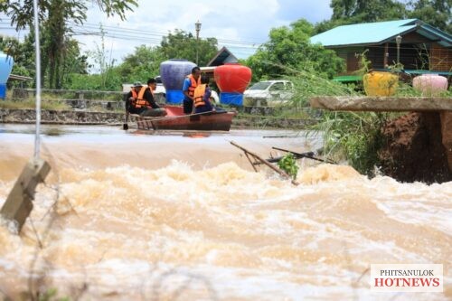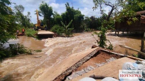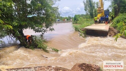 เวลา 14.00 น.วันที่ 2 กันยายน 2568 สถานการณ์น้ำท่วมในพื้นที่ จ.พิษณุโลก ยังคงวิกฤติ โดยเฉพาะที่ ต.เนินกุ่ม อ.บางกระทุ่ม น้ำจากคลองเนินกุ่มไหลแรงกัดเซาะถนนพนังดินบ้านเหนือ หมู่ 1 ขาดกว้างกว่า 10 เมตร ส่งผลให้มวลน้ำทะลักเข้าท่วมบ้านเรือนประชาชนกว่า 30 หลังคาเรือน มีบ้านไม้ 1 หลังถูกน้ำกัดเสาจนเอียงใกล้พัง ขณะที่น้ำยังเอ่อล้นเข้าท่วมพื้นที่เศรษฐกิจ ตลาดวัดตายม และพื้นที่เกษตรใน 6 หมู่บ้าน