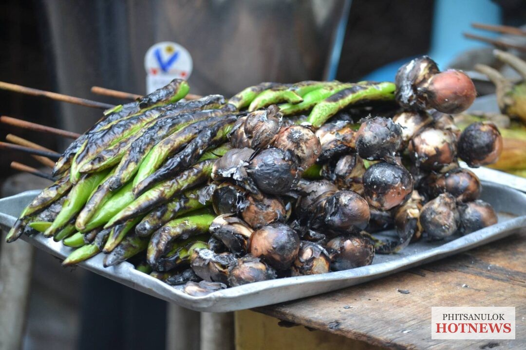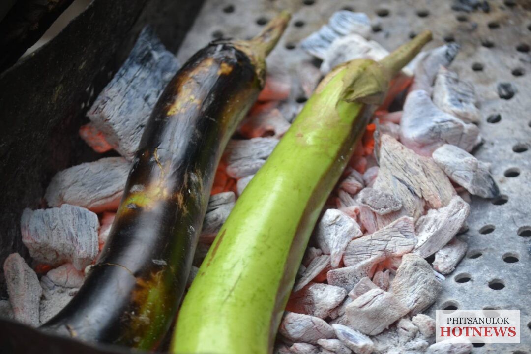 นอกจากนี้ที่ขาดไม่ได้เลยก็คือ มะเขือเผาที่ย่างด้วยเตาถ่านร้อนๆ ลูกค้าจะนิยมซื้อไปกินกับน้ำพริก ที่ร้านตนจะเผาเองสดๆ และยังมีพริกเผาหอมเผา ที่ทำสดๆเตรียมไว้ทำน้ำพริกวันต่อวันเช่นกัน