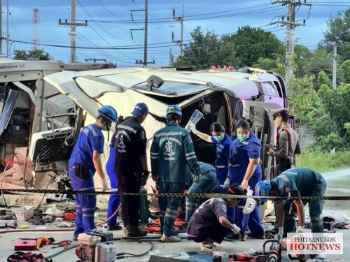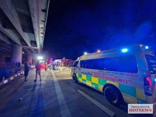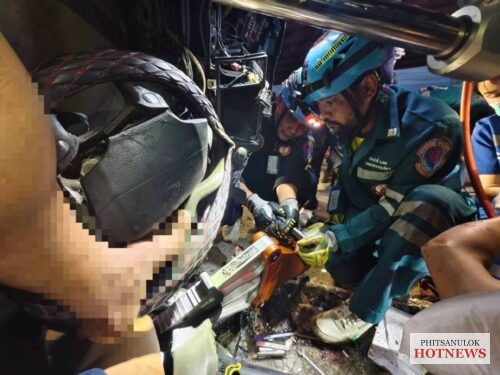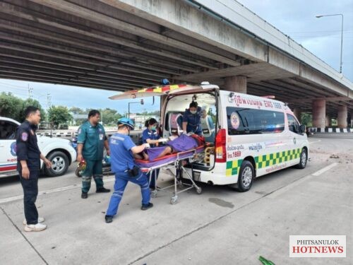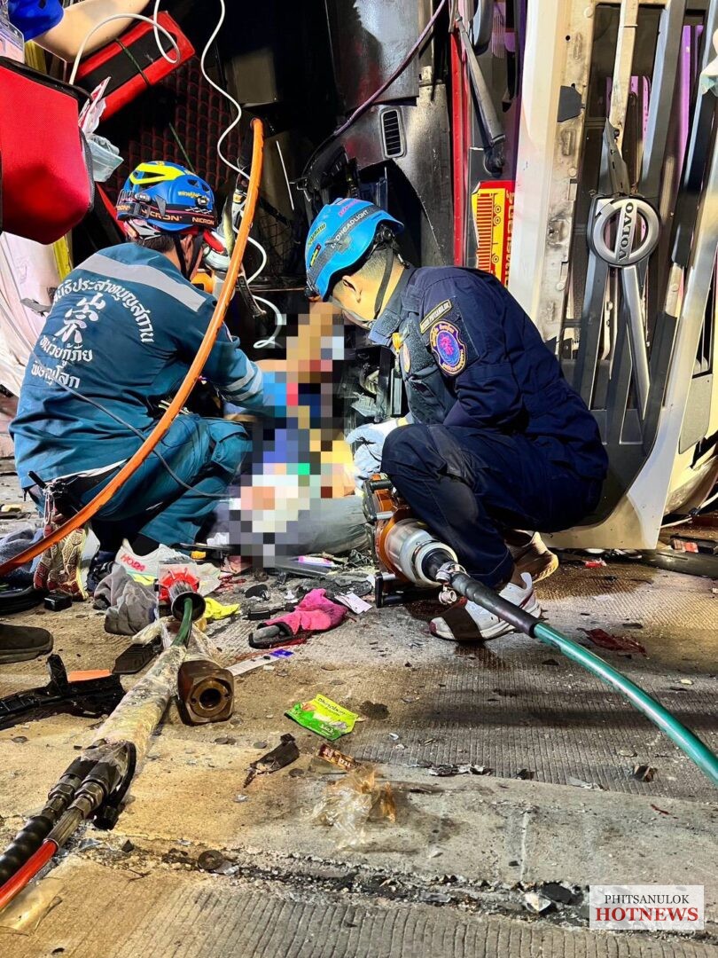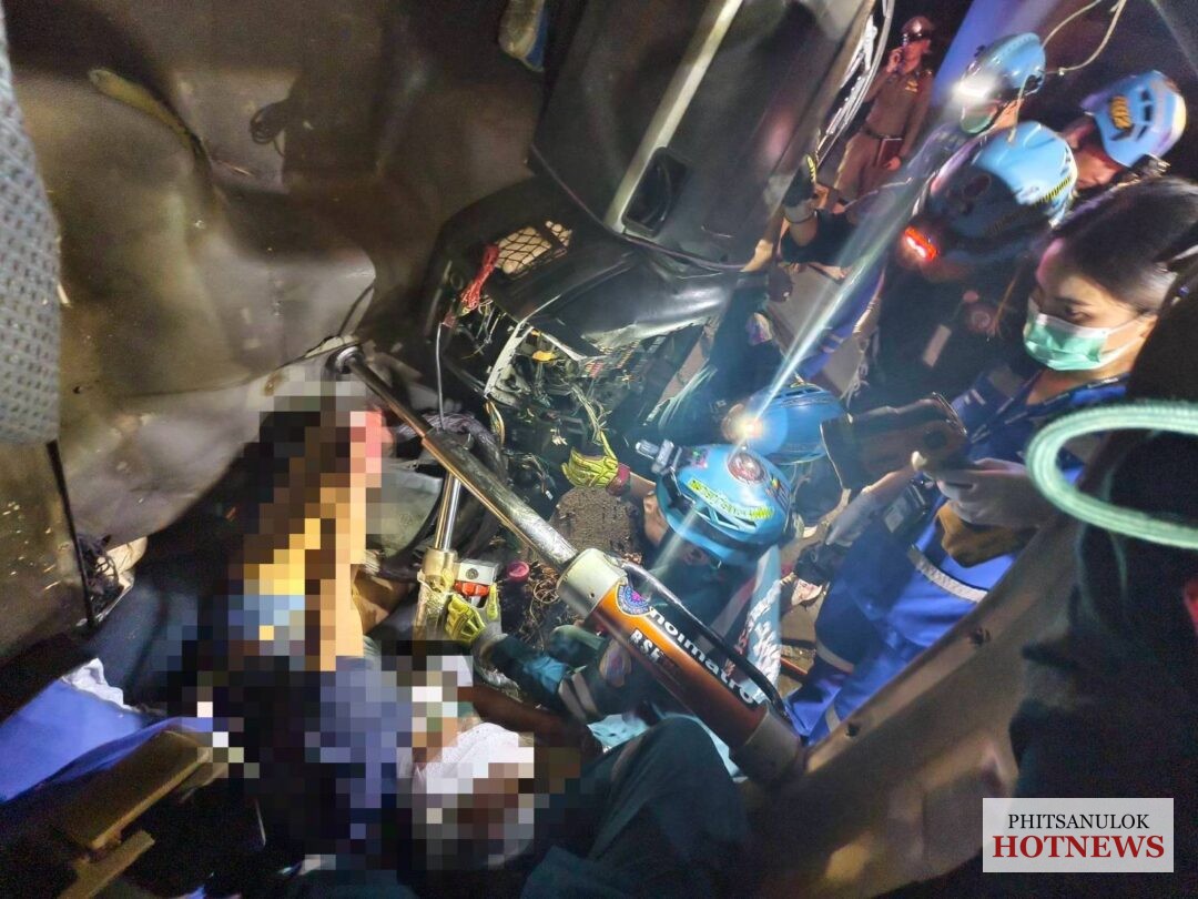เจ้าหน้าที่กู้ภัยพิษณุโลกต้องใช้อุปกรณ์ตัดถ่างในการงัดซากรถเพื่อช่วยเหลือผู้บาดเจ็บอย่างเร่งด่วน ใช้เวลาสักระยะจึงสามารถนำตัวออกมาได้ ก่อนส่งต่อให้ทีมแพทย์กู้ชีพโรงพยาบาลพุทธชินราชทำการปฐมพยาบาล และนำส่งรักษาต่อที่โรงพยาบาลพุทธชินราชพิษณุโลก เบื้องต้นอยู่ระหว่างตรวจสอบสาเหตุของการเสียหลักพลิกคว่ำในครั้งนี้