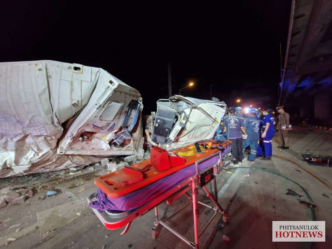 ที่เกิดเหตุพบรถบรรทุกพ่วง Volvo สีขาว ทะเบียนตัวแม่ 70–0935 อ่างทอง และทะเบียนตัวลูก 70–0934 อ่างทอง พลิกคว่ำขวางถนน สภาพพังเสียหายหนัก โดยมีผู้ได้รับบาดเจ็บ 1 ราย คือ นายธนวัฒน์ มณีเสวตร อายุ 52 ปี ชาวตำบลสำพะเนียง อำเภอบ้านแพรก จังหวัดพระนครศรีอยุธยา ถูกอัดก๊อปปี้ติดค้างอยู่ภายในห้องโดยสาร ไม่สามารถออกมาได้
