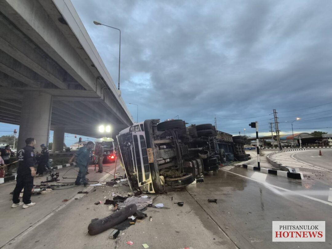 เมื่อเวลา 05.00 น. วันที่ 17 พฤศจิกายน 2568 ศูนย์วิทยุหน่วยกู้ภัยพิษณุโลก มูลนิธิประสาทบุญสถาน รับแจ้งอุบัติเหตุรถบรรทุกพ่วงตู้คอนเทนเนอร์เสียหลักพลิกคว่ำ บริเวณแยกดงประโดก อำเภอเมืองพิษณุโลก หลังรับแจ้งเจ้าหน้าที่อาสากู้ภัยรีบรุดตรวจสอบทันที